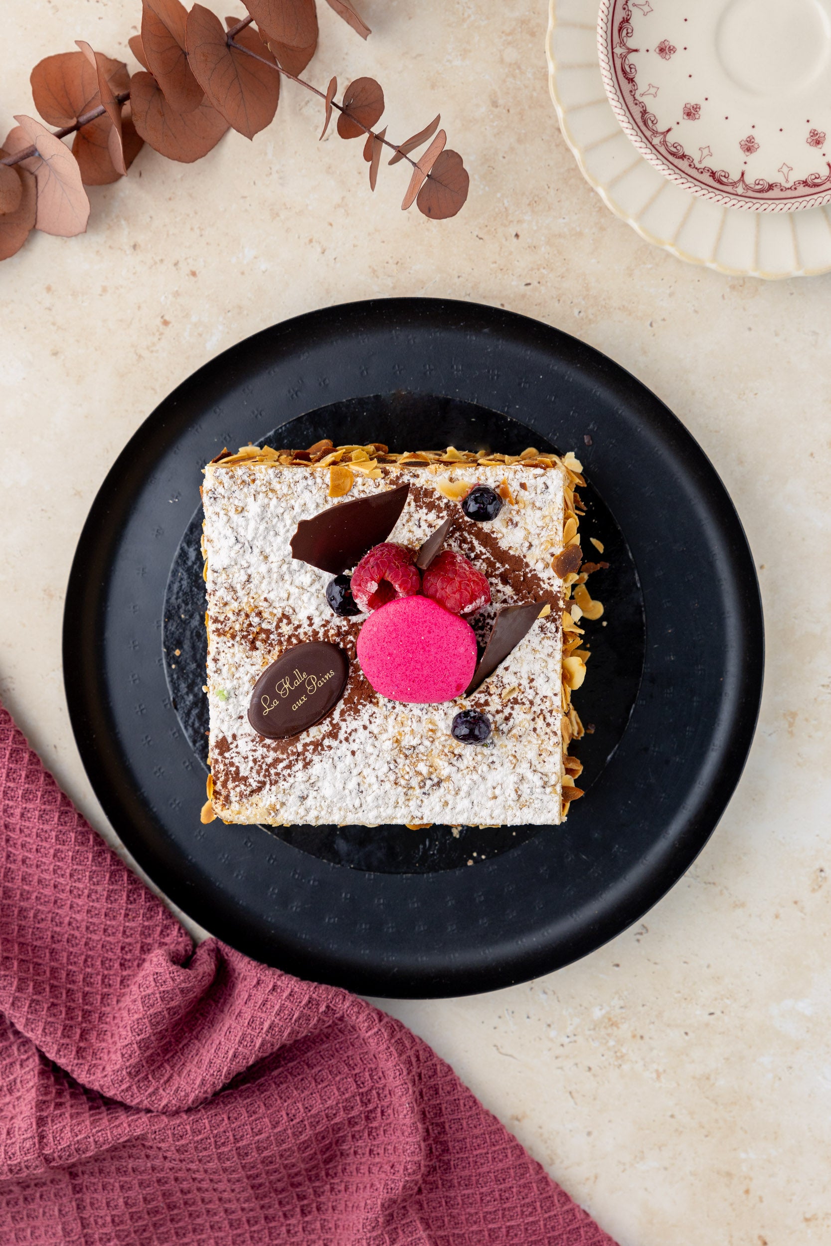 Pâtisserie traditionnelle, le russe est un gâteau composé de couches alternées d'une génoise à la noisette et de crème au beurre pralinée.